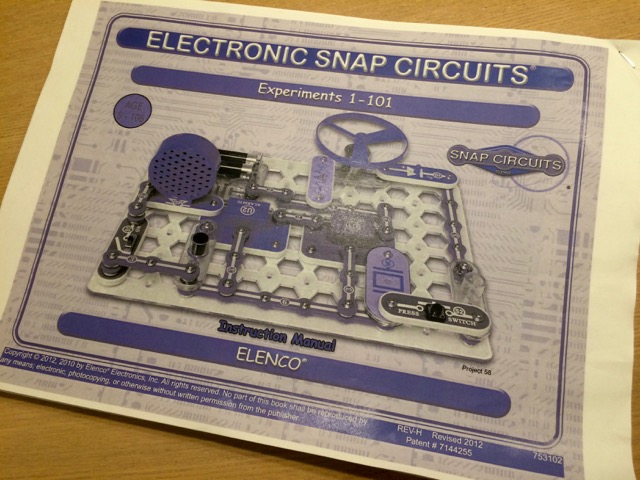 100個の回路が作れるというスナップサーキットを買いました。輸入版なのでオール英語ですが、山ボーイが横についてひとつずつフォローしながら進めました。パチンパチンとスナップで取り付けて電子回路が作れるのは面白いのですが、ICなどの端子の説明が十分でない上に、100のバリエーションに大した価値がないので山キッズ1は一度作ってみて飽きてしまいました。なんというか、応用を利かせるほど知識が身につかないです。